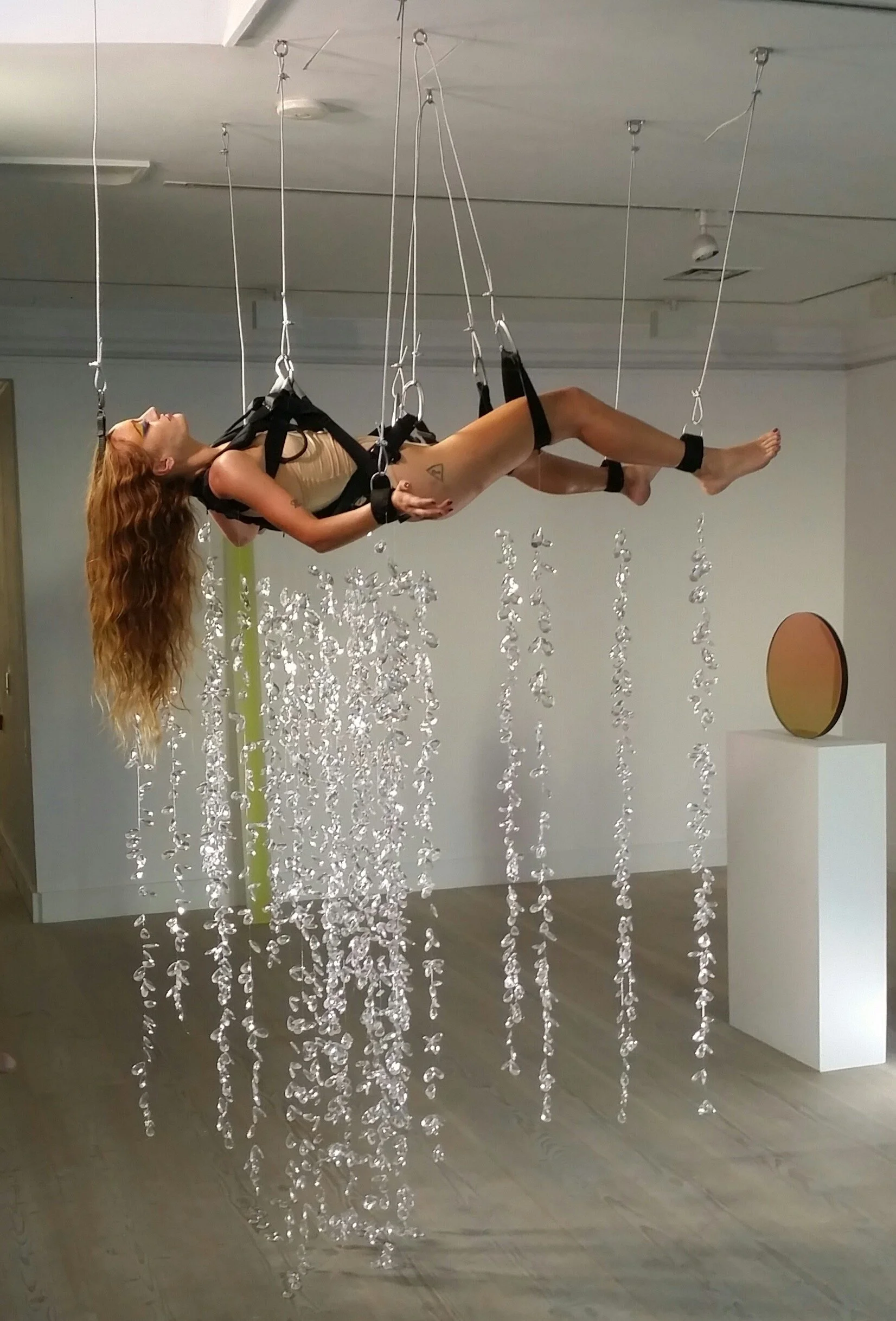 Suspended in the gallery space by rope, Brown inhabits a constellation of carefully arranged crystal prisms that refract and scatter light throughout the environment, activating the architecture and atmosphere of the white-cube space. Her still, suspended body serves as both a physical anchor and an energetic vessel, mediating between material presence and immaterial light.